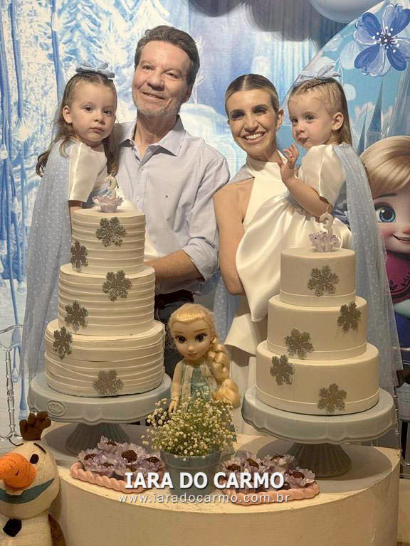 Nathalia Kassis Fernandes e Marcelo Fernandes, pais de Valentina e Antonella, organizaram uma aventura congelante para a comemoração dos 3 aninhos das gêmeas, no Buffet Banana e Canela. O local foi todo personalizado e cada detalhe carinhosamente feito, e como um verdadeiro passe de mágica, a Ana, Hans, Elsa, e o Olaf, ganharam o cenário da comemoração, interpretando cenas e canções do filme. Valentina e Antonella puderam comemorar a data junto dos personagens, bem como de familiares e amiguinhos da escola, que se esbaldaram nos brinquedos locais, nas brincadeiras com os monitores e se deliciaram com o cardápio servido.
